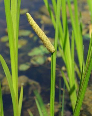 Der Echte Kalmus (Acorus calamus) gehört zur Familie der Aronstabgewächse, wächst nur an