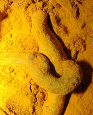 Die getrocknete und gepulverte Wurzel des Kurkuma (auch Gelbwurz genannt)
